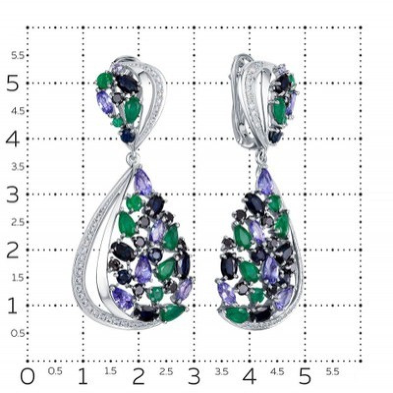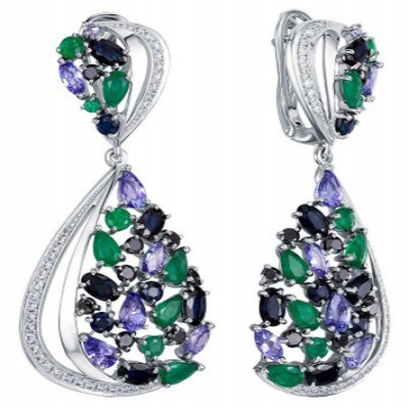 Серьги из белого золота с подвесками Vesna jewelry 21177-251-203-00 с изумрудами, сапфирами, танзани
