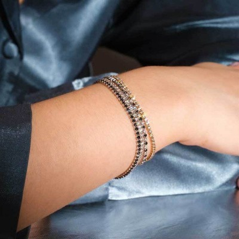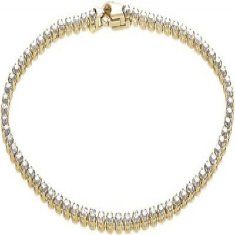 Элегантный золотой браслет в стиле ''теннис'' с дорожкой из драгоценных бриллиантов по всей длине. Лаконичное и в то же время дорогое украшение отлично дополнит изысканный образ его владелицы, будь то брючный деловой костюм или роскошное вечернее платье.